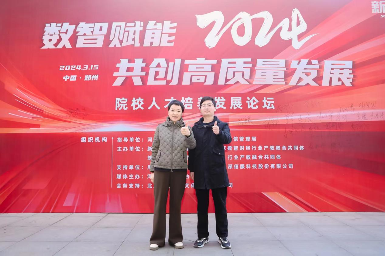 为进一步推动学科专业建设,促进商科专业数智化转型,2024年3月15日,商学院骨干教师胡椰青、黄振兴一行受邀参加了在国家大学科技园(郑州)召开的以“数智赋能、共创高质量发展”为主题的2024年院校人才培养高质量发展论坛。