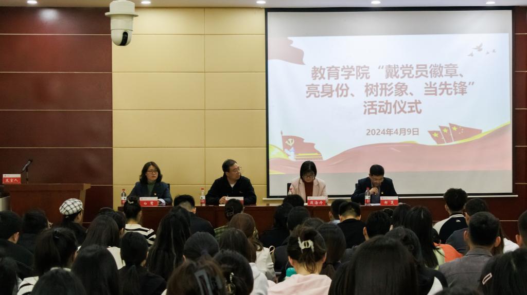 为充分发挥基层党组织战斗堡垒作用和党员先锋模范作用,教育引导广大党员始终牢记党员身份,教育学院党总支于4月9日在图书馆102教室开展了“戴党员徽章、亮身份、树形象、当先锋”活动启动仪式。学院党总支书记张甲楠,党总支纪检委员、教学副院长段海丹,党总支宣传委员白鹭,党总支统战委员郝昊和全体师生党员参加了此次活动。活动启动仪式由郝昊主持。