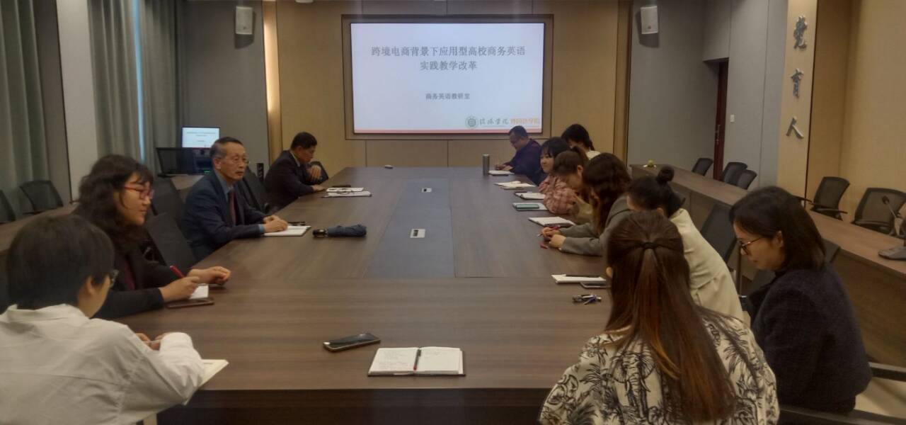4月12日下午,外国语学院商务英语教研室在外语楼110会议室开展主题为“跨境电商背景下应用型高校商务英语实践教学改革”的精品教研活动。信阳学院督导专家韩保宪教授、何杰英教授及全体商务英语教研室教师参加了本次教研活动。活动由教研室主任陈俊明老师主持。