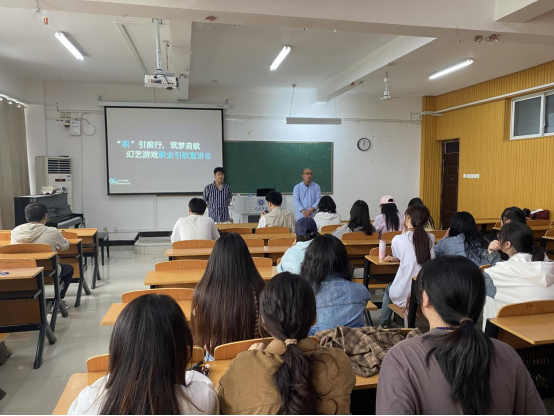 苏家兵对公司做了简单介绍,他指出,该公司主营游戏和动画制作,成立至今已有11年之久,外包业务有30项之多。他鼓励学生们多走出去、多实践,不断提升自己的职业素养和专业综合能力。鼓励高年级同学把握与用人单位面对面交流的机会,积极主动寻求实践和就业,早日找到理想的工作。