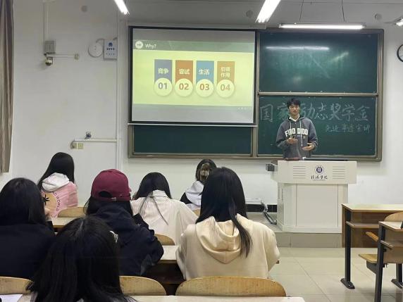 最后由22级英语本科13班侯利伟同学由自身经历对获得国家励志奖学金的经验进行分享。侯利伟同学首先就竞争、尝试、生活、引领作用四个方面介绍自己为什么要争取励志奖学金。接着侯利伟同学从自身经历分享如何通过获得证书来增加综测成绩,他建议大家积极参加各类活动,并且分配好空闲时间,做好学习和社团间的时间平衡。最后侯利伟同学对学习经验进行简单的分享,他首先提出大家要有自律能力,其次指出大家要有改变自我的勇气、寻找有效的学习方法,侯利伟同学分享了百词斩及多邻国两个学习软件。