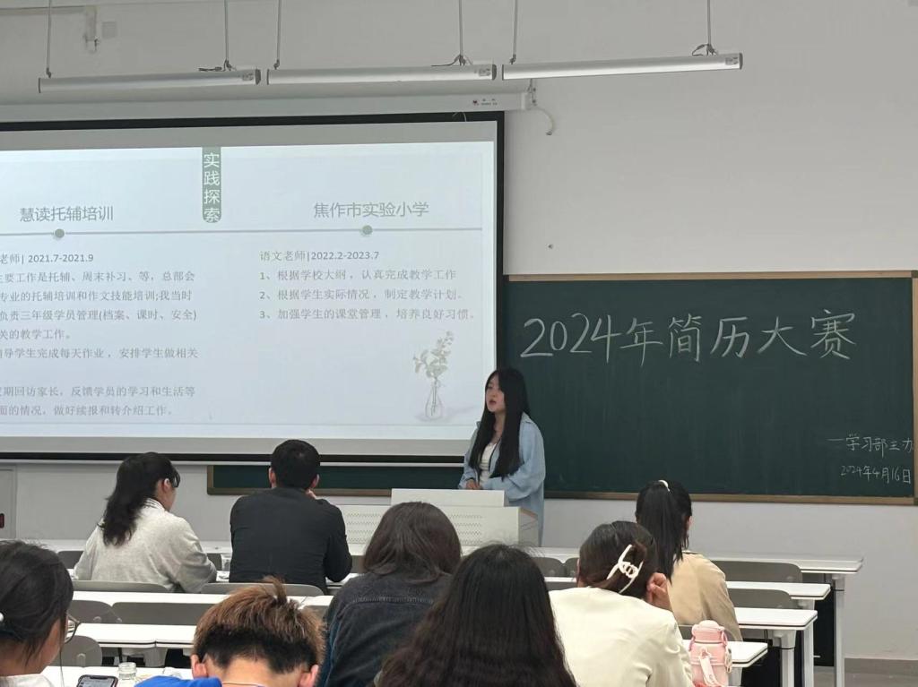 为提升我院学生的简历制作水平和就业能力,提高学生职业素质和求职竞争力,4月中旬我院于教学楼305教室举办了2024年简历大赛。本次大赛共14名参赛人员,陶思宇、黎东升老师担任评委,大赛由学习部干事王贤朴主持。
