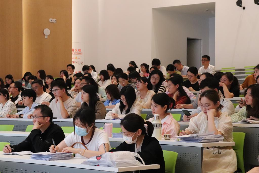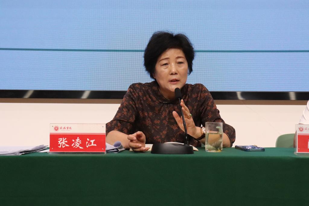 张凌江院长指出大四学生在论文答辩时出现的具体问题。在指导教师方面,她提出要提升学术论文质量,指导教师应加大指导力度、重视初审反馈、增强学生写作能力和撰写技巧。她鼓励指导教师坚持负责到底、不放弃任何一位学生,并分享了自己的指导经历,深刻了解指导老师的辛苦,但秉承着为学生负责的使命,仍然要求老师们要用不懈的努力帮助学生们完成论文,顺利毕业。