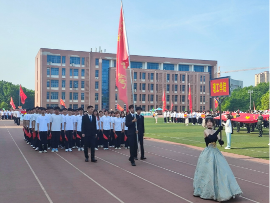 开幕式,操场上彩旗飘扬,理工学院方队高举红旗、高呼院训,迈着整齐的步伐,昂首走进会场。
