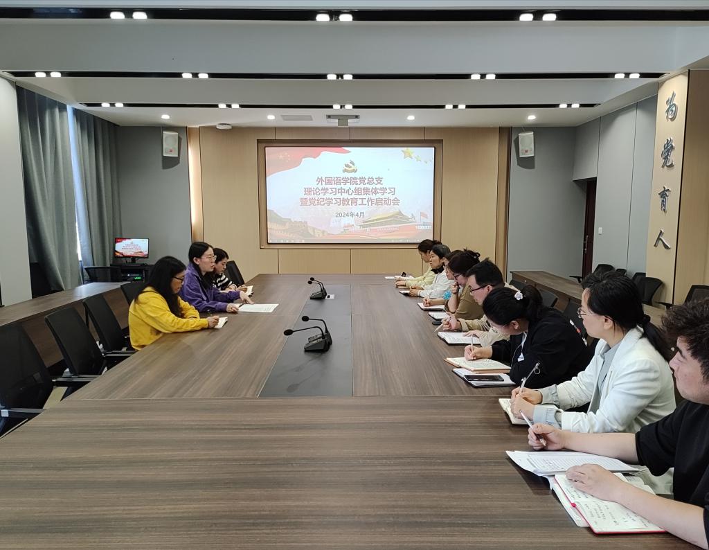 4月23日下午,外国语学院党总支理论学习中心组在外语楼110会议室召开集体学习会暨党纪学习教育工作启动会。中心组全体成员参加了学习。程娇炎主持了集体学习。
