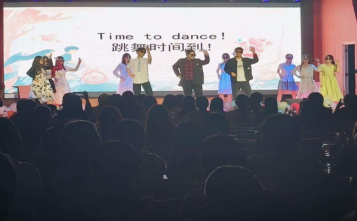 经过层层选拔,最终成功进入决赛的选手一共有五组。决赛共分才艺展示环节和英文主持环节,选手们先后通过歌舞等才艺形式让现场气氛逐渐热烈起来;然后又以流利的口语、真挚的情感和声情并茂的表演,给现场的观众带来了一场视听盛宴。最终大赛决出一等奖1组、二等奖2组、三等奖2组。同学们印象最深的是第二组《非诚勿扰》,作为一等奖的获得组,她们的表演是相亲秀,男女嘉宾一上台就惊艳了全场,幽默的语言、炫酷的才艺、搞笑的表演,逗得观众们捧腹大笑,全场气氛达到最高潮。随后由街舞社、说唱社等社团带来歌舞秀表演,歌声娓娓动听、舞蹈精彩夺目,把庆典晚会推向了另一个高潮。