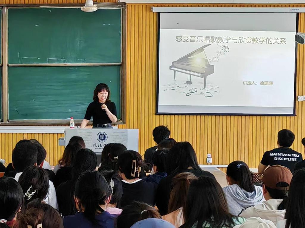 徐老师通过通俗易懂的举例,阐述了两者不同的教育目标,以及两者要共同承担的德育责任,指出歌唱教学是通过“唱”来培养学生的识谱能力和歌唱技能技巧,而欣赏教学则侧重于培养学生具有良好的听觉感受能力和欣赏音乐的好习惯,在教学时,应当在设计教学大纲时做好区分,做好引导者角色,让学生成为主体,真正做到“以乐育人、德育并进”。