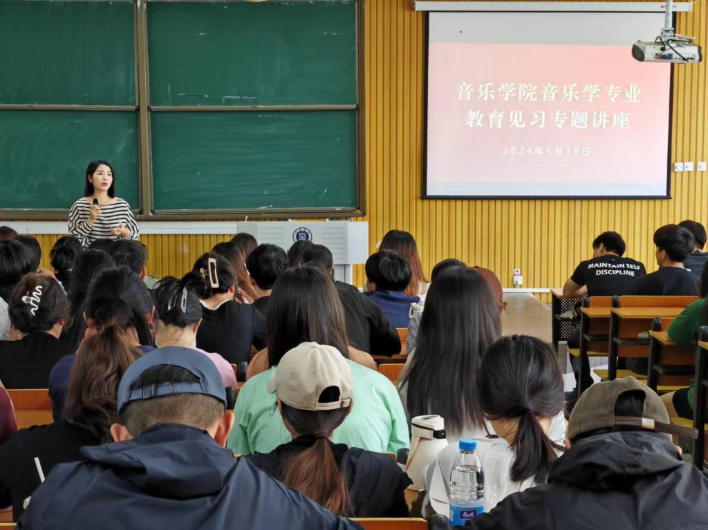 为进一步促进师范生教育教学技能提升,5月18日上午,音乐学院在艺术楼101开展了“2021级音乐学生师范专业教育见习”专题讲座。本次讲座特别邀请了信阳市羊山中学校长赵春雷和高级音乐教师徐珊珊。音乐学院副院长杨辉主持了活动,学院2021级音乐学专业全体学生参加并聆听了讲座。