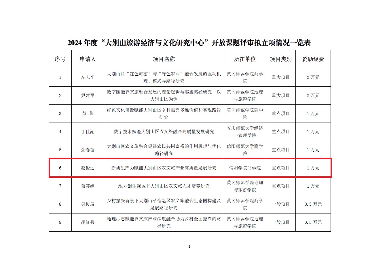 5月22日,2024年度湖北省普通高校人文社科重点研究基地“大别山旅游经济与文化研究中心”开发课题立项进行了公示,我院赵俊远副教授申报的《新质生产力赋能大别山区农文旅产业高质量发展研究》获批重点项目立项,资助经费1万元。
