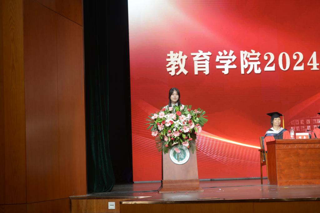 会上,毕业生代表、河南省优秀毕业生、信阳学院第14届校园明星、成功考取2024年河南省选调生的2020级小学教育本科2班韩佳益同学在发言中回顾了自己大学四年的求学生涯,有努力、有收获、有成长。深刻表达了对母校的眷恋和感恩之情,也会带着这份感情踏上新征程。