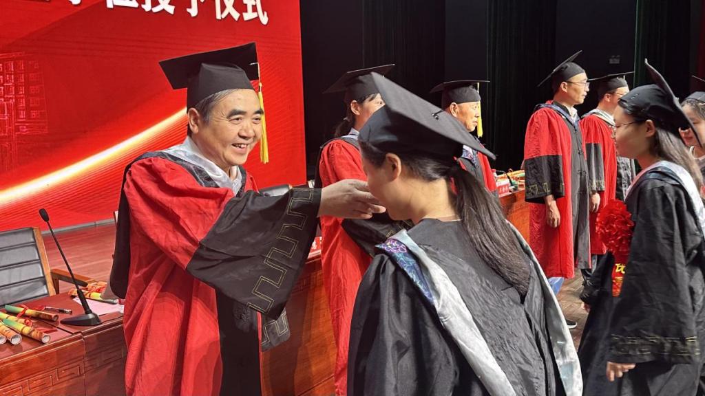 张聪宣读了《数学与统计学院关于授予2024届本科毕业生学士学位的决定》,随后院长俞迎达及学位评定分委员会委员们分别为获得学士学位的全体毕业生正冠拨苏,授校长寄语,并合影留念。