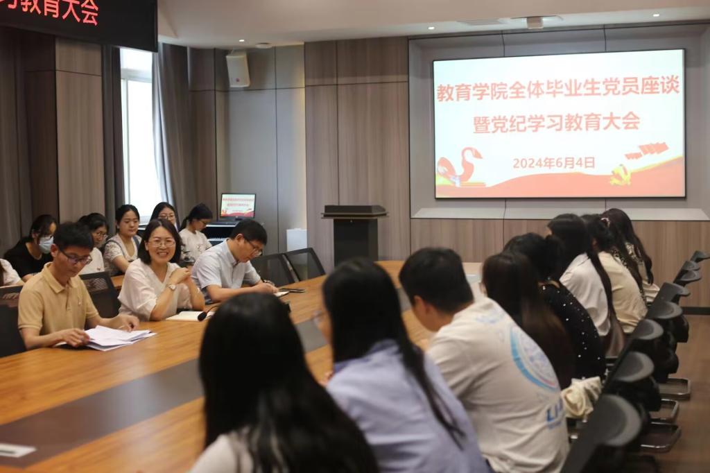 为深入学习贯彻习近平总书记关于党纪学习教育的重要讲话和重要指示精神,做好毕业生党员教育管理和党员组织关系转移工作,引导毕业生党员在新的工作、学习岗位上继续发挥党员的先锋模范作用。6月4日下午,教育学院在社科楼109会议室开展2024届毕业生党员座谈会暨党纪学习教育大会,学院党总支书记刘颖方、党总支委员郝昊、组织员张文龙以及全体毕业生党员参加了会议。
