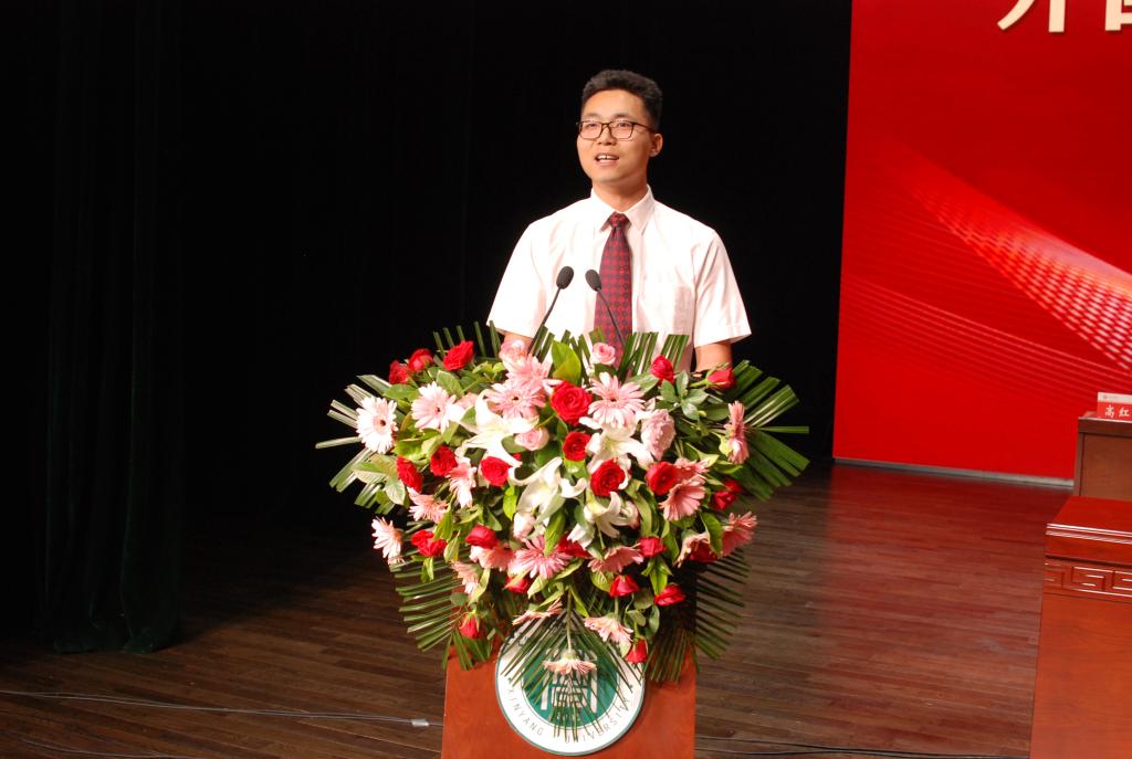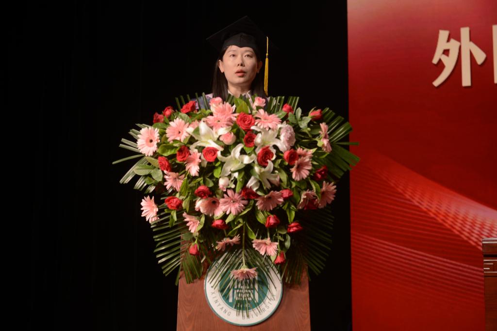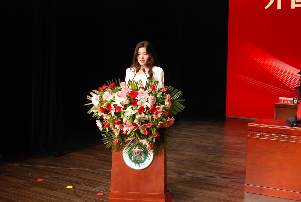 教师代表董文静在发言中回顾了与同学们课上和课下相处的点点滴滴,表达了对学生的不舍和惜别之情。同时以校友的身份讲述了与学校共同成长的感人经历,希望同学们能够做到知行合一,秉承着“内外兼修、学贯中西”的院训去书写人生新的辉煌篇章。