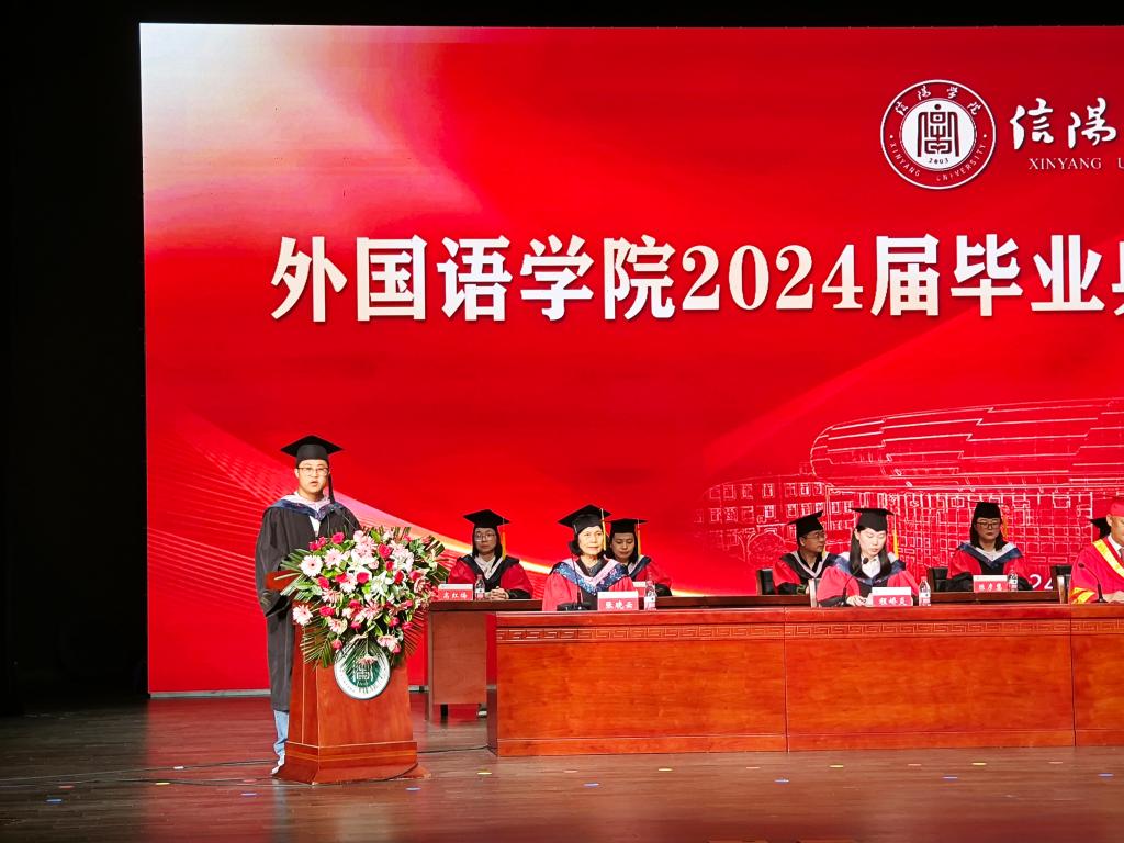 最后,信阳学院副校长王强讲话。他向即将毕业生提出希望和要求:一是希望同学们能够继续发扬外国语学院的精神,勇敢面对困难,勇于担当责任,为推动人类文明的进步贡献自己的力量;二是希望同学们终身学习,学习是一生的事业,只有不断学习才能跟上时代的步伐,希望同学们珍惜时间,不断提升自己的专业素养和综合能力;三是希望同学们树立正确的人生观和价值观,在追求个人发展的同时,也要关注社会的发展和进步,能够以真诚的品质和良好的道德风范为社会做出积极的贡献;四是希望同学们保持开放的心态,在这个多元化的世界里,应该学会尊重和欣赏不同的文化,以包容的心态去接纳不同的观点和文化,为促进世界和平与发展贡献自己的智慧和力量。最后,祝愿同学们在未来的道路上一帆风顺!前程似锦!希望同学们请抽点时间常回家看看。