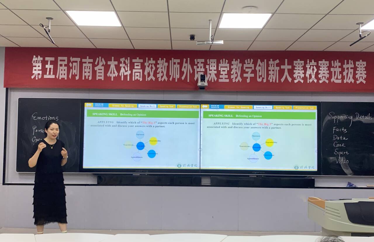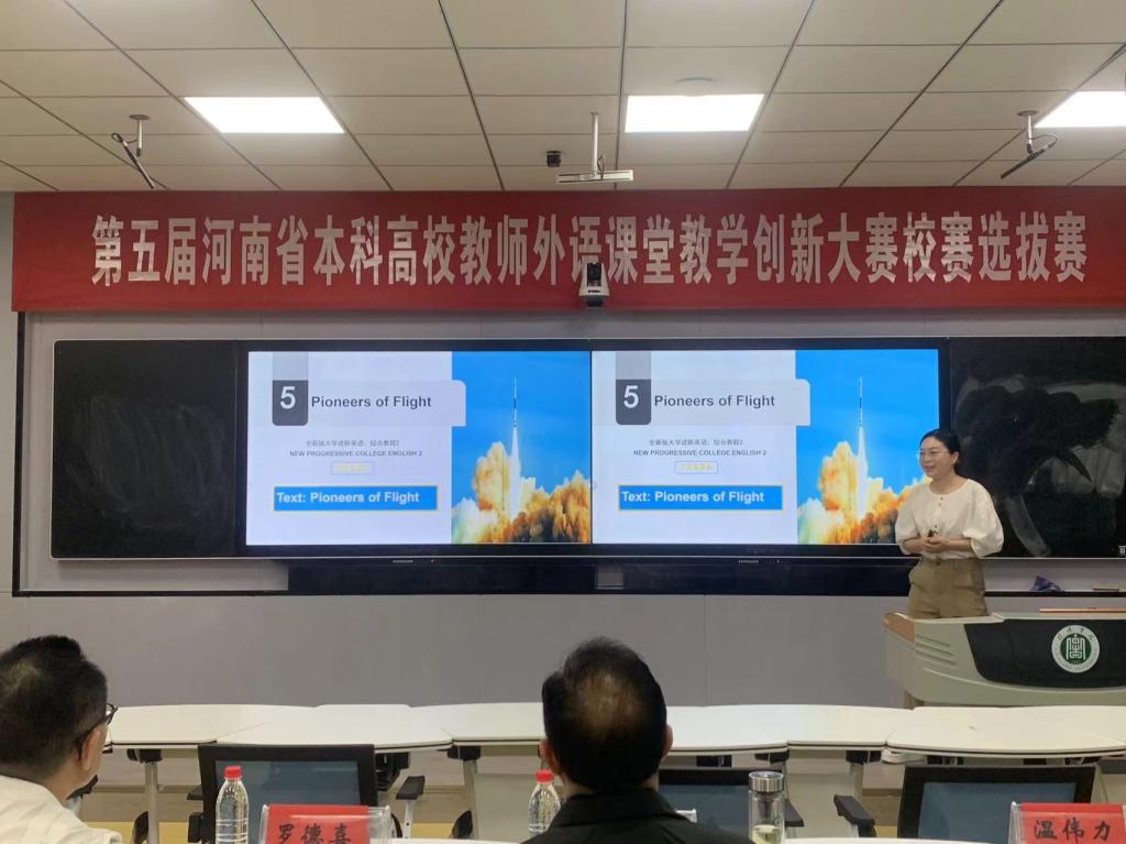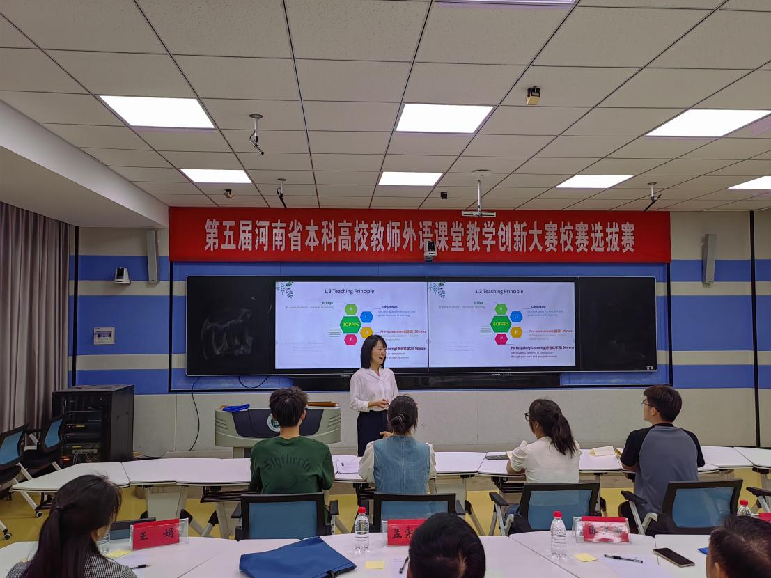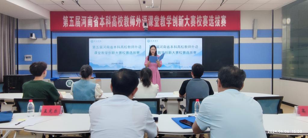 为深入贯彻全国、全省教育大会精神,落实立德树人根本任务,引导高校教师潜心教书育人、推动课堂革命,根据第五届河南省本科高校教师课堂教学创新大赛外语教学赛道暨第十五届全国高校外语教学大赛要求,我校第五届河南省本科高校教师外语课堂教学创新大赛校赛选拔赛于6月6日在人文楼南楼智慧教室113、109分组举行。经个人申报,院部推选的11名教师参加选拔赛。教务处处长徐久成、教学质量监控中心主任陈文涛、外国语学院院长罗德喜、教师教学发展中心主任孟宪乐等担任本次竞赛评委。