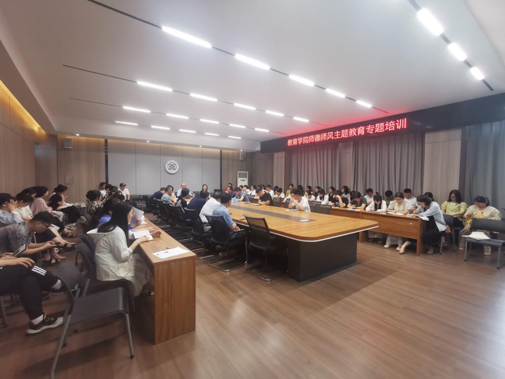 6月11日下午,教育学院在社科楼109会议室召开了师德师风主题教育培训会,名誉院长、党总支书记刘颖方、副院长段海丹及班子成员、专家教授和全体青年教师参加了此次会议,会议由名誉院长主持。