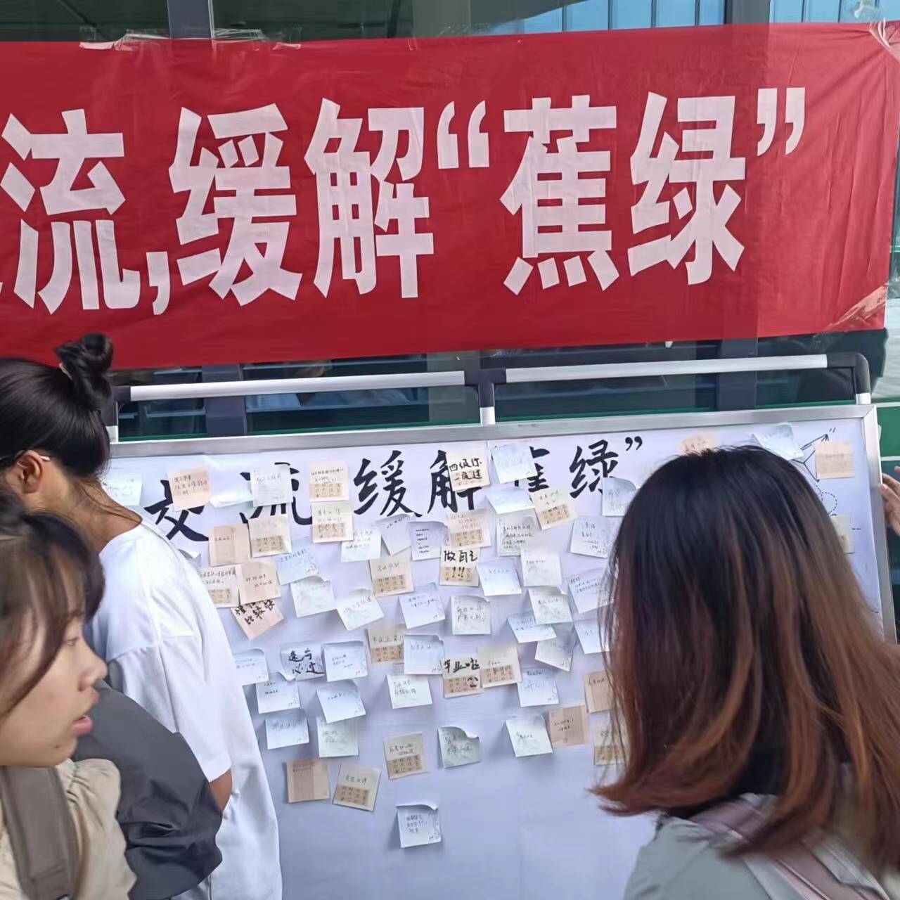 为缓解学生学业焦虑,保持心理健康,6月6日到6月7日,我院在教学楼连廊处举办以“心灵交流,缓解‘蕉绿’”为主题的心理健康活动。本次活动由千千结艺社、玄墨书法协会主办,学生会社团部及心理健康部共同承办,面向文学院全体在校学生展开,采取线下活动方式进行。