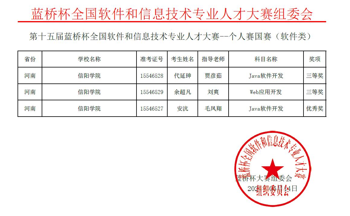 近日,由工业和信息化部人才交流中心主办的第十五届蓝桥杯全国软件和信息技术专业人才大赛总决赛落幕。大数据与人工智能学院共有3名学生通过省赛选拔参加全国总决赛。经过激烈比拼,21级计算机科学与技术本科1班学生于超凡、22级计算机科学与技术本科2班学生代延珅获国家级三等奖,22级数据科学与大数据技术本科1班学生安沆获优秀奖。
