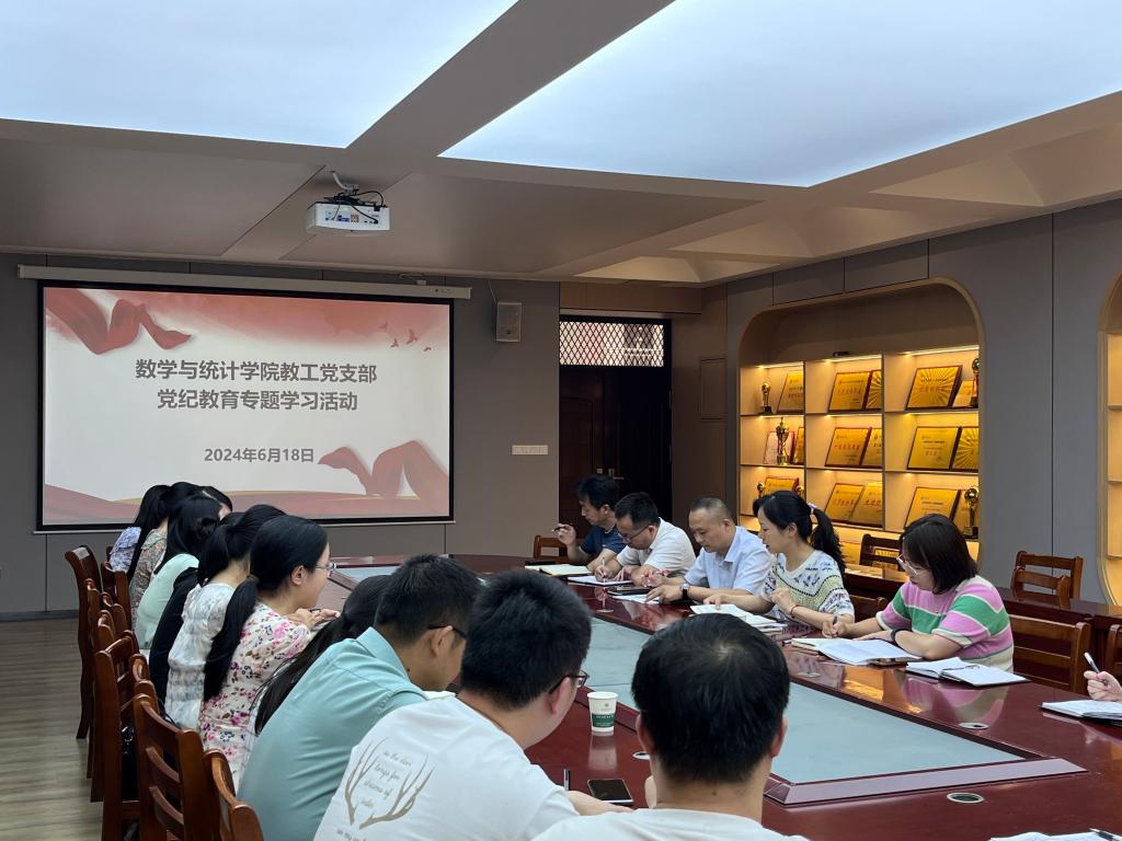 进一步增强全体党员的纪律意识,推动党纪学习教育走深走实,6月18日下午,数学与统计学院在数计楼407会议室举行教工党支部党纪教育专题学习活动,学院党总支书记高昌慧、全体教工党员参会,会议由高昌慧主持。