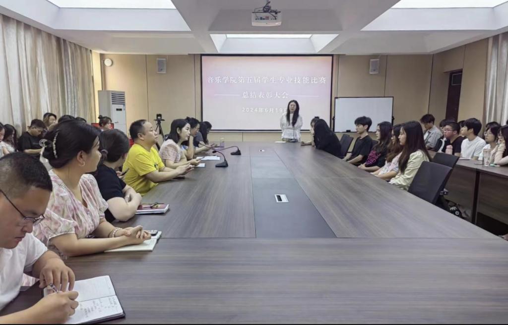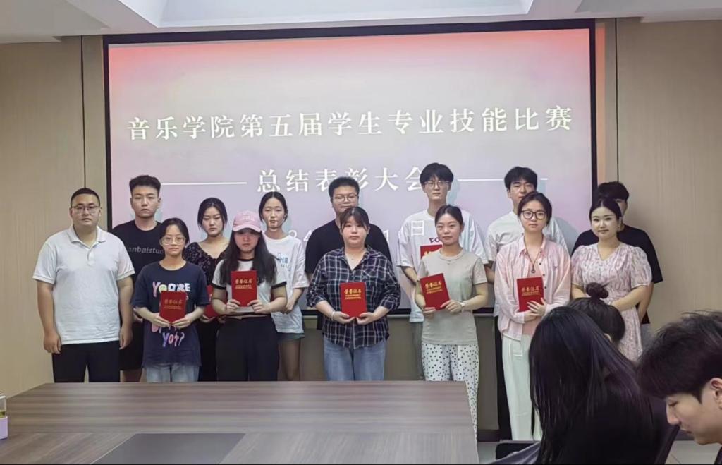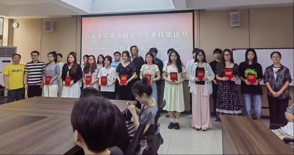 为了更好的丰富实践教学,提高学生学习积极性,促进学生专业技能的提升,音乐学院于5月21日-5月27日举办了为期一周的第五届学生专业技能大赛。近日,音乐学院在艺术楼215会议室举行总结表彰大会,党总支书记郑山峰、副院长杨辉出席了表彰活动,学院班子成员、教研室主任、辅导员代表及全体获奖学生参加了活动。活动由张岩老师主持。