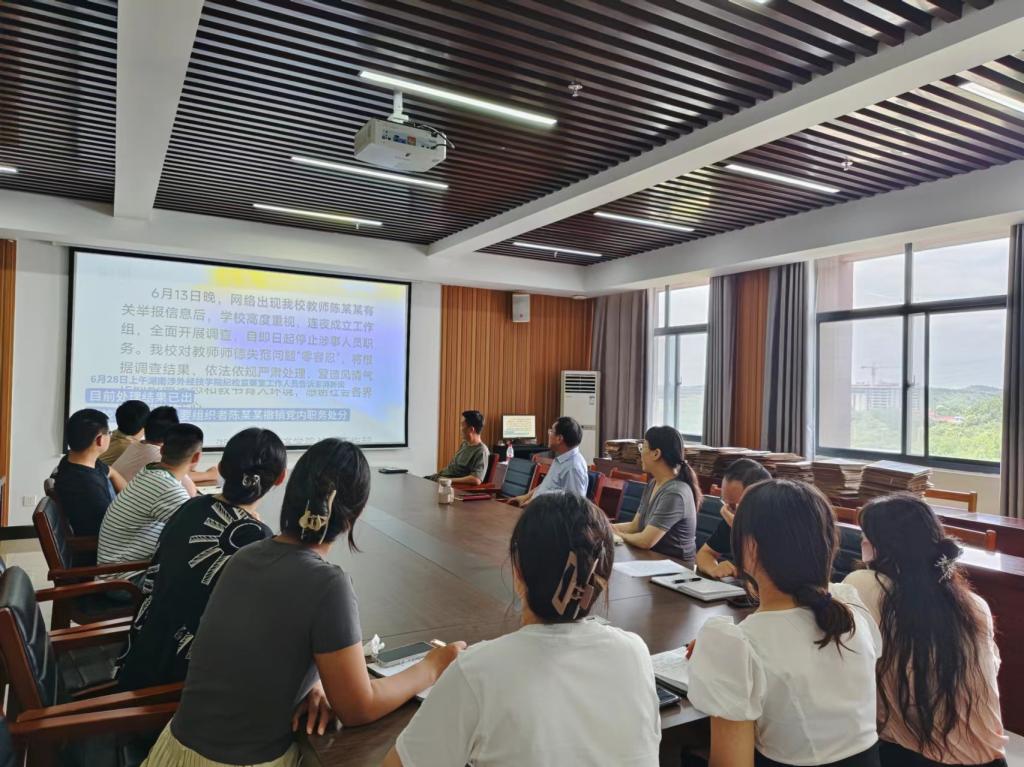 胡秀云书记传达了《信阳学院关于师德师风专项整治工作实施方案》等关于师德师风建设的文件精神,同时通过剖析近期高校内违反教师职业行为十项准则的典型案例,对与会教师进行了深刻的警示教育,强调了师德师风建设的重要性和紧迫性。