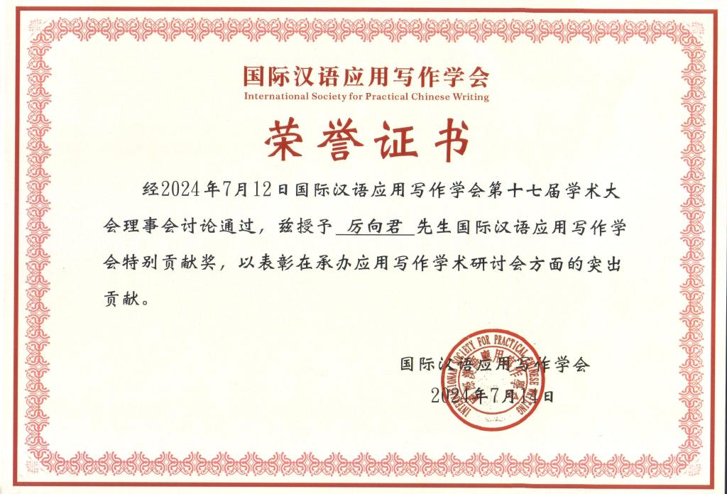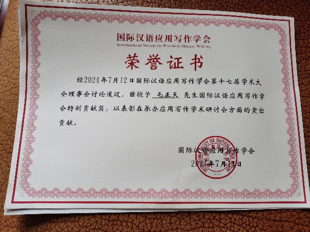 本次大会也是纪念国际汉语应用写作学会发起成立30周年的纪念大会。此次大会上,除了论文获奖颁奖外,还颁发了为促进应用写作学术研讨会方面作出突出贡献的特殊贡献奖。信阳学院文学院特聘教授毛正天、厉向君获得此殊荣。