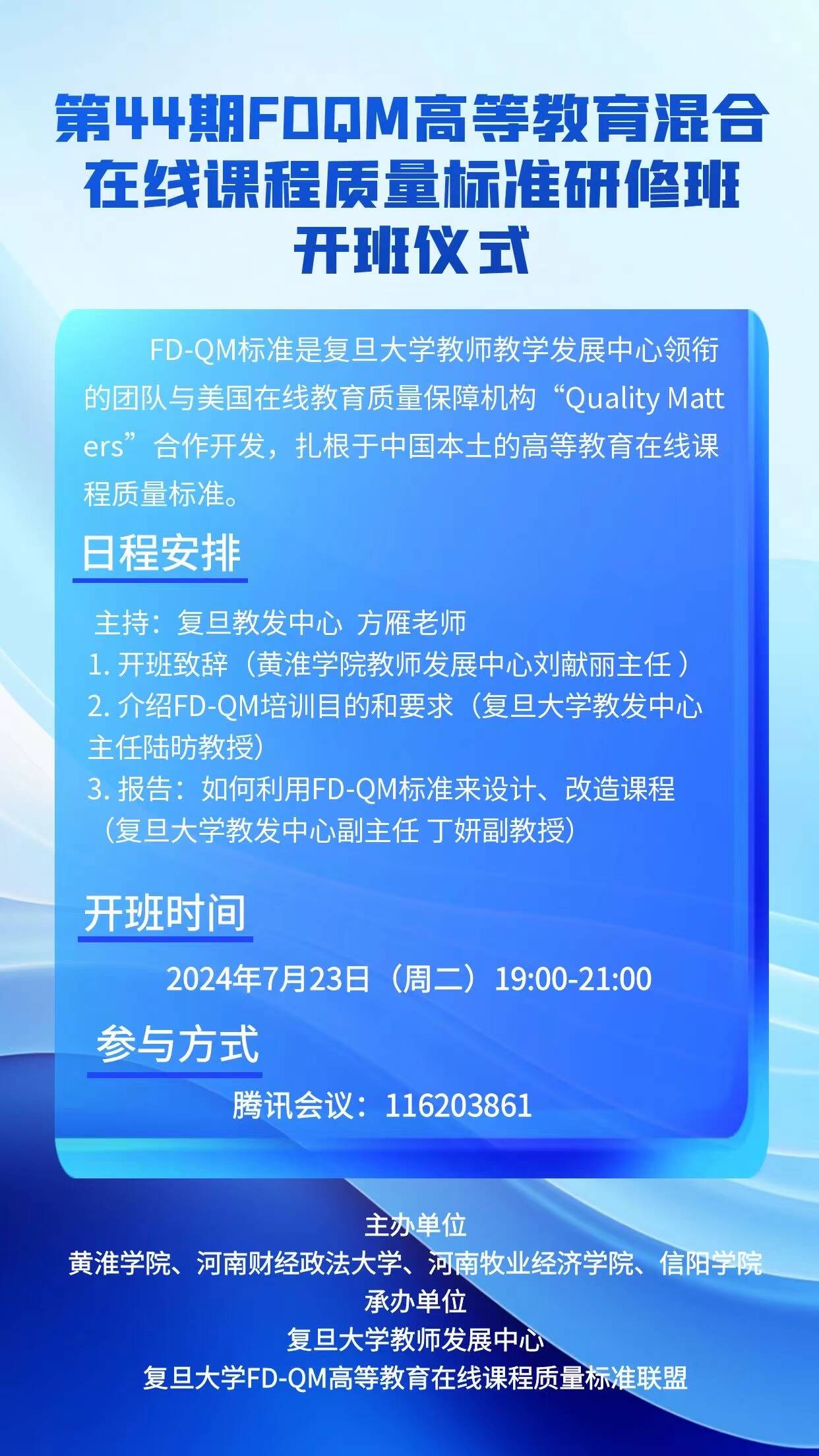 7月23日,由学校教师教学发展中心联合黄淮学院、河南财经政法大学、河南牧业经济学院邀请复旦大学专家团队开展了“FD-QM高等教育混合在线课程质量标准”线上研修班,学校教师教学发展中心组织教师参加了此次培训学习。研修班邀请复旦大学教师教学发展中心主任陆昉,复旦大学教师教学发展中心副主任丁妍做主讲嘉宾,与各院校中青年教师围绕这一主题展开了研究与探讨,复旦大学教师教学发展中心方燕老师主持了此次培训活动。