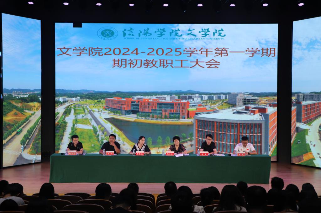 为进一步明确新学期工作任务,确保期初整体工作目标落实到位,9月1日上午,我院在教学楼113演播厅召开文学院2024-2025学年第一学期期初教职工大会。文学院全体教职工参加此次会议,会议由党总支书记李赟主持。