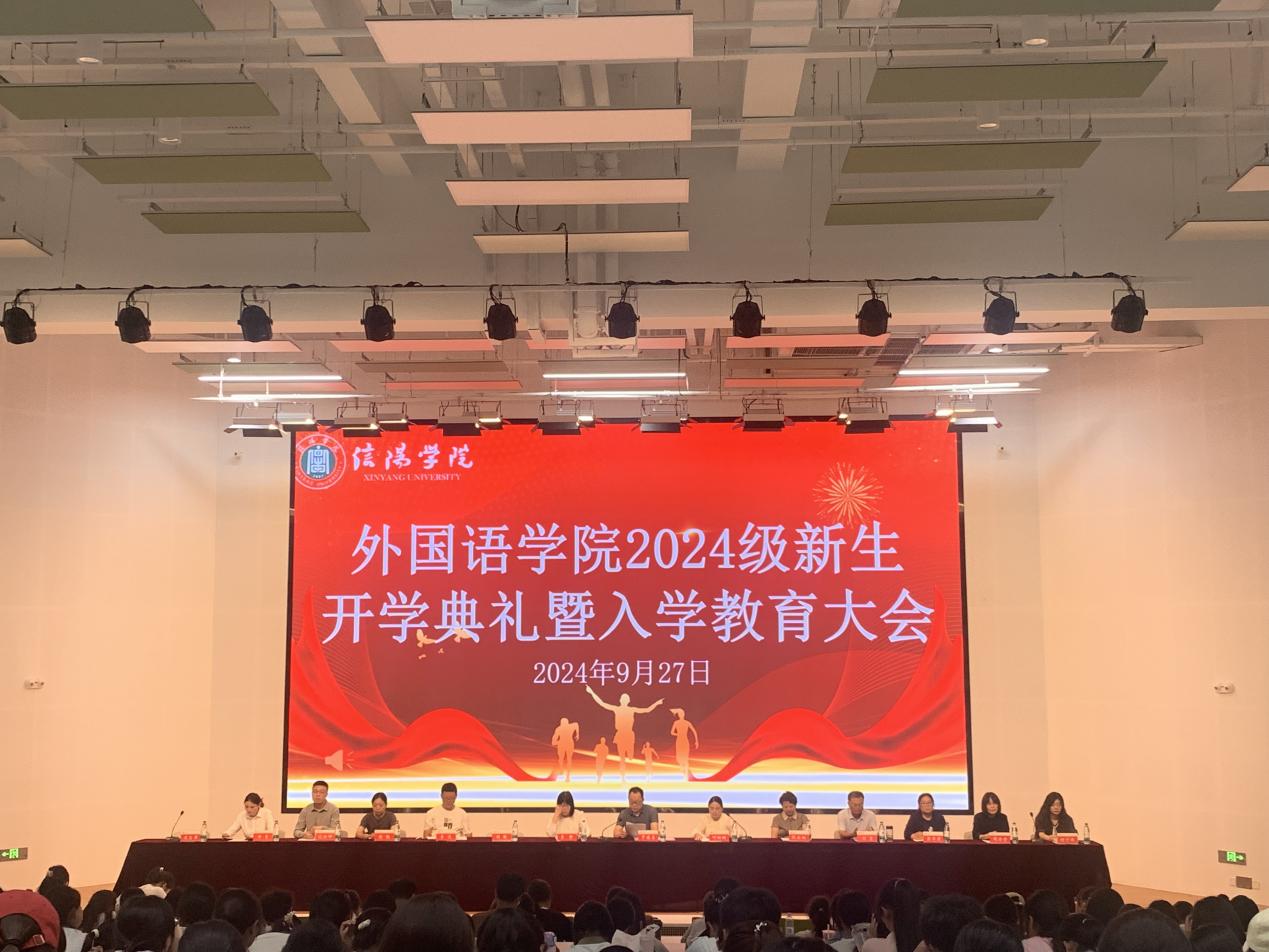 2024年9月29日信阳学院外国语学院开学典礼在学院礼堂隆重举行。外国语学院院长罗德喜、教学副院长李静、教授代表段云虹、刘勇、行政干事梁书荣、教学干事李达、学工干事何珊珊、团总支书记郑青、24级新生辅导员及全体新生齐聚一堂,共同见证这一重要时刻。此次开学典礼标志着新学年的开始,为学院的师生们注入了新的活力与希望。