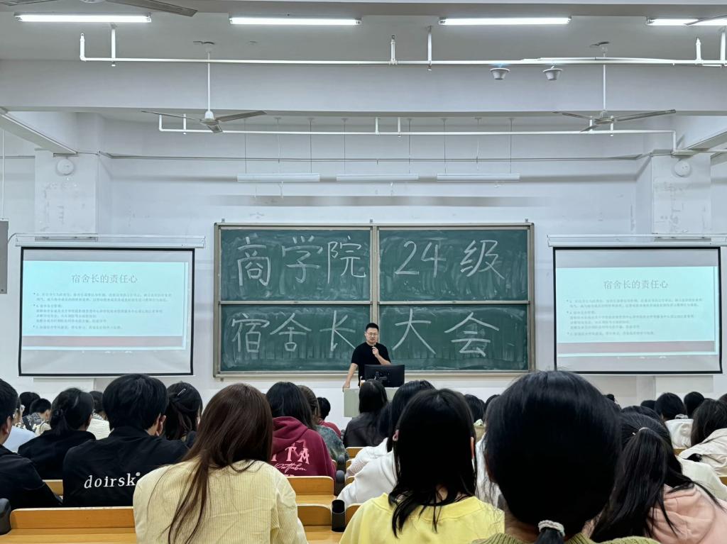为培养学生良好宿舍生活习惯、规范宿舍管理和建设优良学风,10月8日下午,商学院在综合楼203教室召开2024级宿舍长大会。学院宿舍分管老师周力、辅导员陈镜屹、2024级全体宿舍长以及学院宿舍管理服务中心全体成员参加了本次大会。