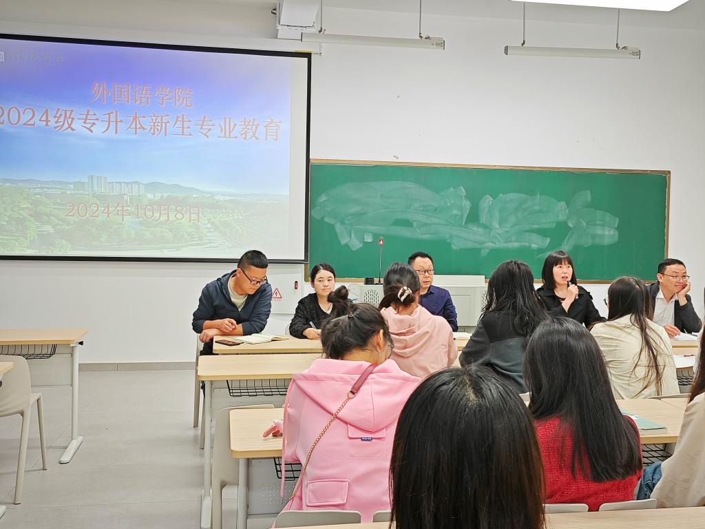会议伊始,李静院长对专升本同学表示热烈欢迎,强调了外国语学院在教学、科研和国际交流等方面的优势与特色。随后,英语专业负责人周善春老师解读了专升本阶段的培养方案和专业课程设置。课程涵盖高级外语技能提升、跨文化交际、翻译理论与实践等多个重要板块,旨在全面提升学生的专业技能、综合素养。
