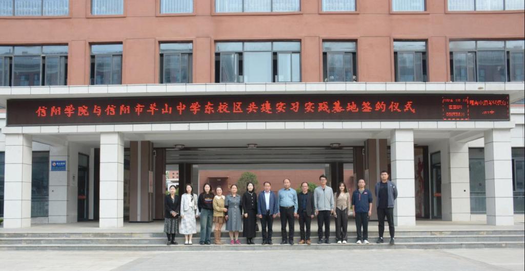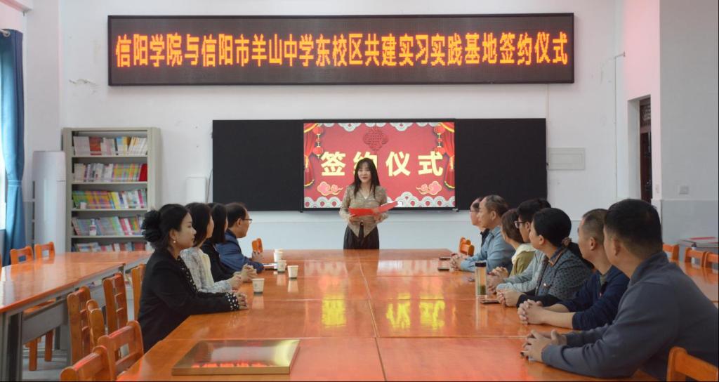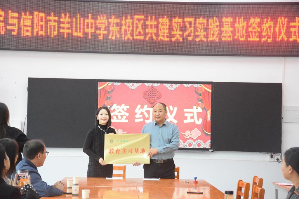 为提升音乐学(师范)专业学生实践教学质量,促进学生实践能力提高,10月10日上午,音乐学院党总支书记郑山峰、副院长杨辉带领学院有关教师前往信阳市羊山中学东校区,参加音乐学院与信阳市羊山中学东校区共建实习基地签约授牌仪式暨访企拓岗促就业活动。信阳市羊山中学东校区校长尚满、副校长赵春雷等出席签约仪式。