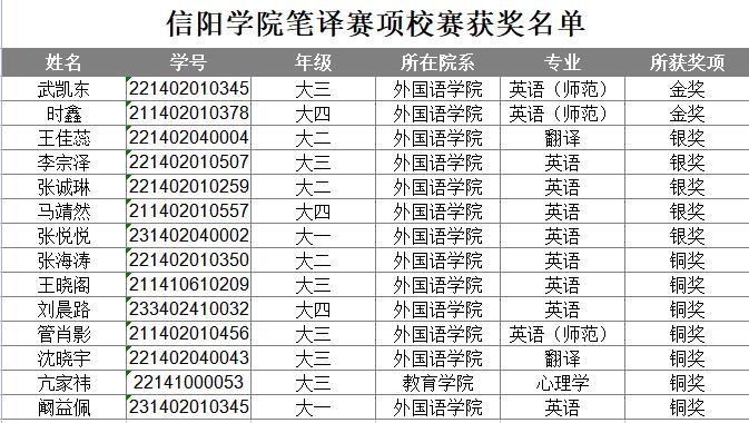 祝贺以上获奖选手!外国语学院竞赛指导团队的老师们正在进行省赛各赛项的筹备工作,省赛选手的二轮选拔也将在近期启动。届时各位指导老师们将和代表我校的省赛选手们一起努力备赛,争取在省赛阶段能有新的突破,赛出信院风采,共同向国赛迈进。
