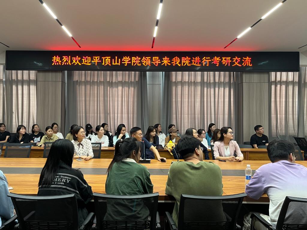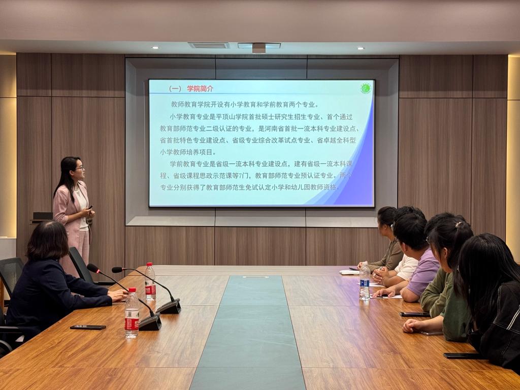 同学们首先观看了平顶山学院宣传片,初步了解了该校有关建校历史、教学资源,发展前景等方面的概况。曹丽乐老师分别从学院和专业基本情况、办学条件和特色、专业师资队伍、学费及奖助体系四个方面介绍了平顶山学院的研究生招生政策。着重介绍了该校的教学资源,强调了该校“厚师德,强师能”的办学特色,解读了2025年硕士研究生招生专业目录,让同学们更好的把握学习方向。王院长进一步强调了学院师资情况及办学特色和优势,李书记在讲话中表示,平顶山学院依山傍水,自然环境优美,人文底蕴深厚,具有健全的设施组织、实践基地等办学条件及完善的奖助体系,欢迎同学们到校深造,攻读小学教育专业硕士学位。