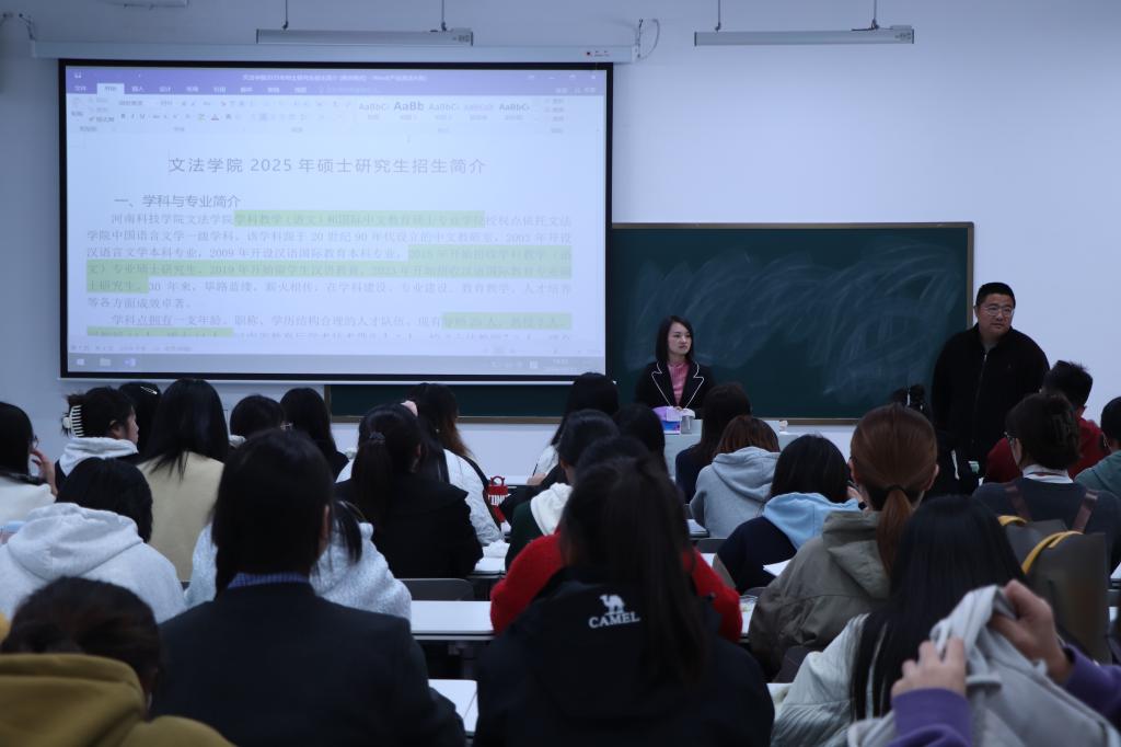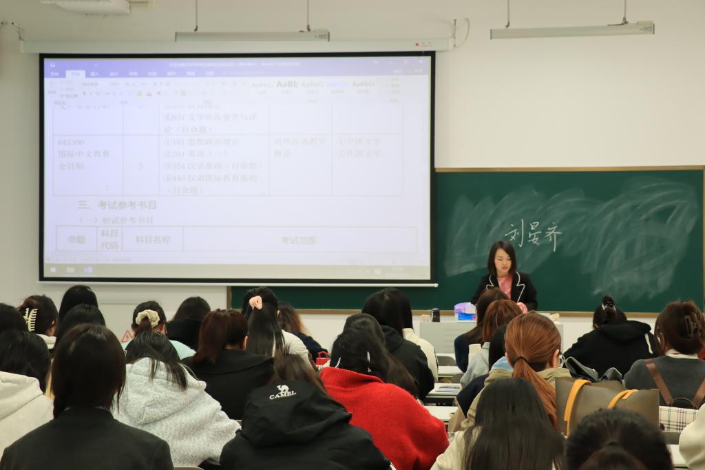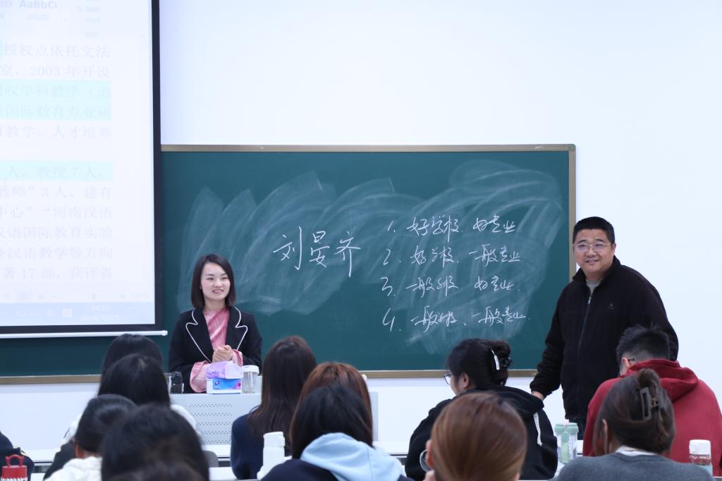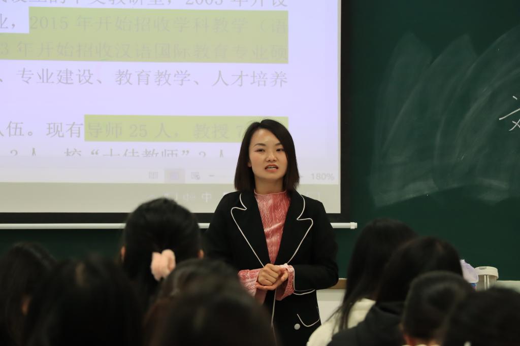 刘宴齐老师主要从学科与专业简介、招生目录、考试参考书目等三个方面,对文法学院汉语国际教育专业的招生政策进行了详细介绍,概述了文法学院开设汉语国际教育专业以来各项教学工作的开展进程。同时,她向大家介绍了河南科技学院在该专业所具备的师资力量、秉持的教学理念、以及目前所取得的培养成果,并结合相关考试的参考书目,对考试范围、初试、复试均进行了全面的分析。