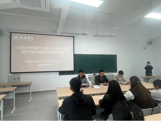 10月29日中午,社会科学学院党总支在南湖校区教二楼303教室举行第十七期入党积极分子培训班开班仪式暨专题党课。学院党总支副书记胡志国、第一学生党支部书记王顺兴、第二学生党支部书记杨俊东与第十七期全体入党积极分子参加了本次学习活动。仪式由王顺兴主持。