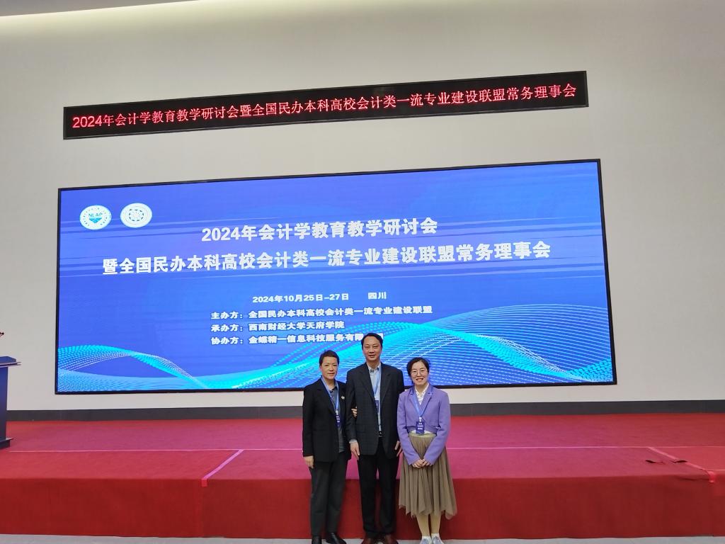10月25日至27日,2024年会计学教育教学研讨会暨全国民办本科高校会计类一流专业建设联盟常务理事会在成都举行。本论坛由全国民办本科高校会计类一流专业建设联盟和西南财经大学天府学院主办,金蝶精一信息科技服务有限公司承办。商学院会计学专业负责人胡椰青和财务管理专业负责人李晓娜应邀参加了本次会议。