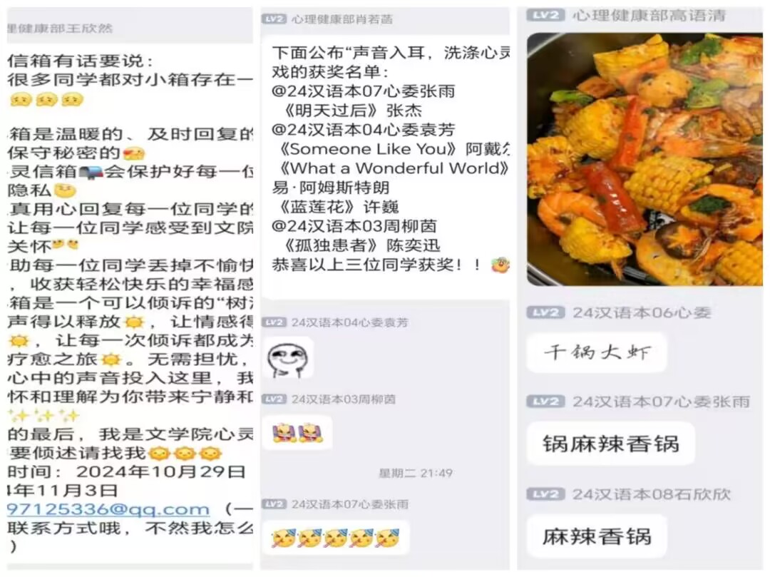 线上活动主要于QQ群中进行,活动“心灵信箱”鼓励学生以匿名方式倾泻心中郁闷;“声音入耳,洗涤心灵”支持同学们分享治愈音乐抚慰心灵;“美食贩卖,大饱快乐”引导同学们打开心灵窗户,排解负面情绪,拥抱全新生活。
