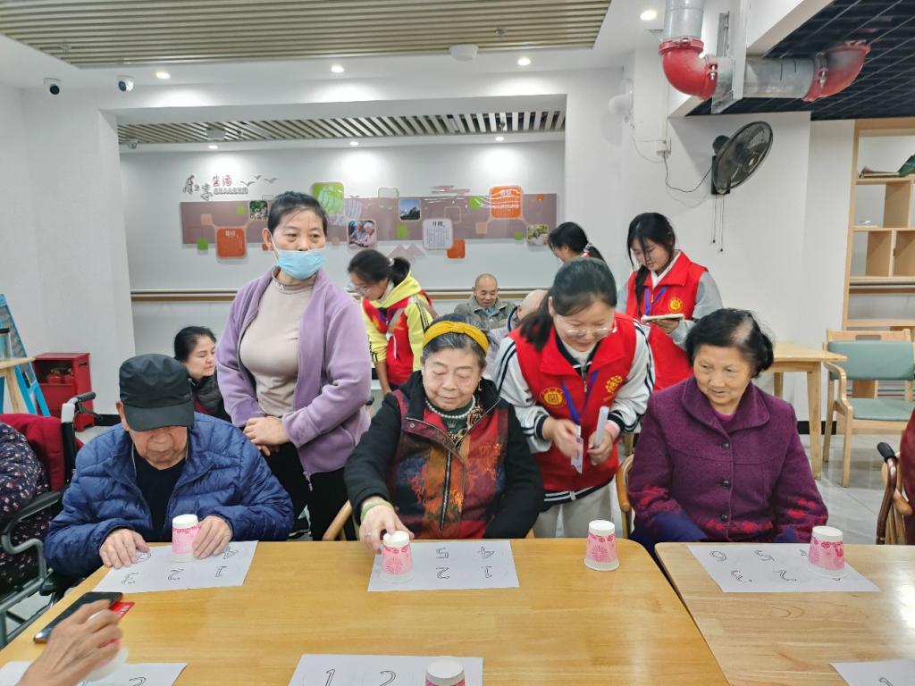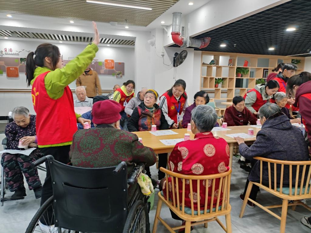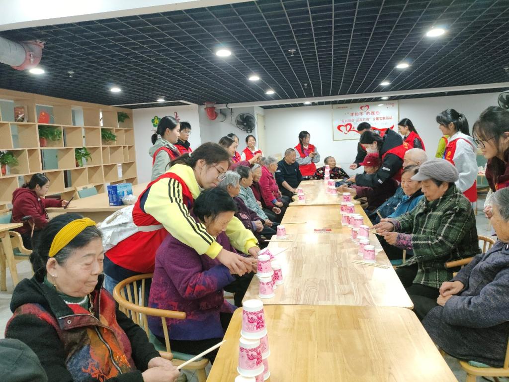 志愿队的9名志愿者在志愿队队长的带领下到达养老服务中心。他们怀着满满的热情和精心准备的节目,一进入敬老院就迅速行动起来。志愿者们分散在老人周围,与老人一起做手指操、传递纸杯游戏、盖数字等游戏。在活动过程中,志愿者们主动与老人们聊天,听老人们讲述过去的故事,分享生活中的点滴。老人们的脸上洋溢着幸福的笑容,敬老院里充满了欢声笑语。