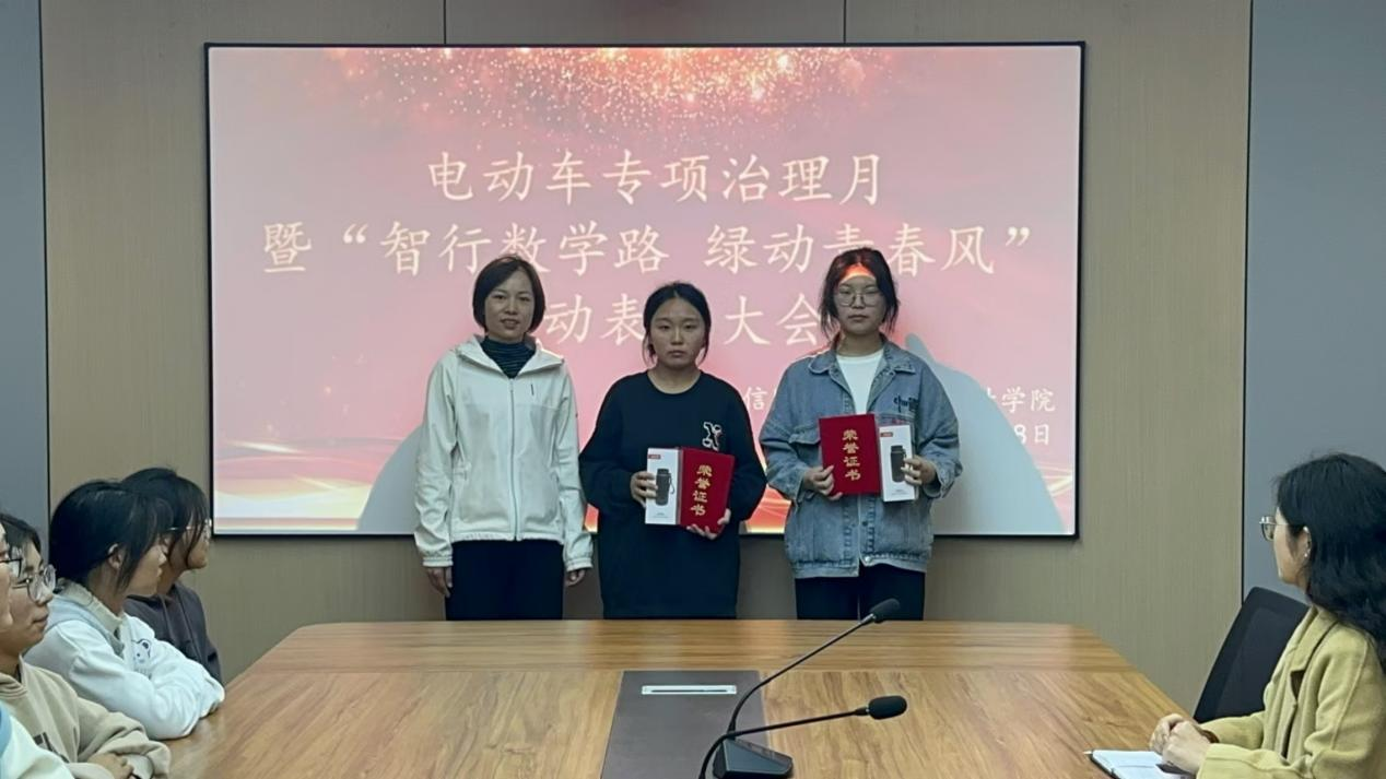 会上,胡涛宣读了《数学与统计学院关于电动车专项治理月暨“智行数学路,绿动青春风”绿色校园行活动表彰决定》,随后,各位领导老师为表现突出的个人和集体进行颁奖。