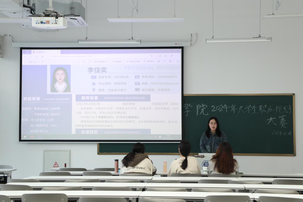 为引导大学生树立正确的成长成才观和择业就业观,科学合理规划学业与职业发展,11月中旬,我院于教一楼416教室举办2024年大学生职业规划大赛,文学院辅导员刘娟、常歌、王悦担任此次大赛评委,大赛由杨堃主持。