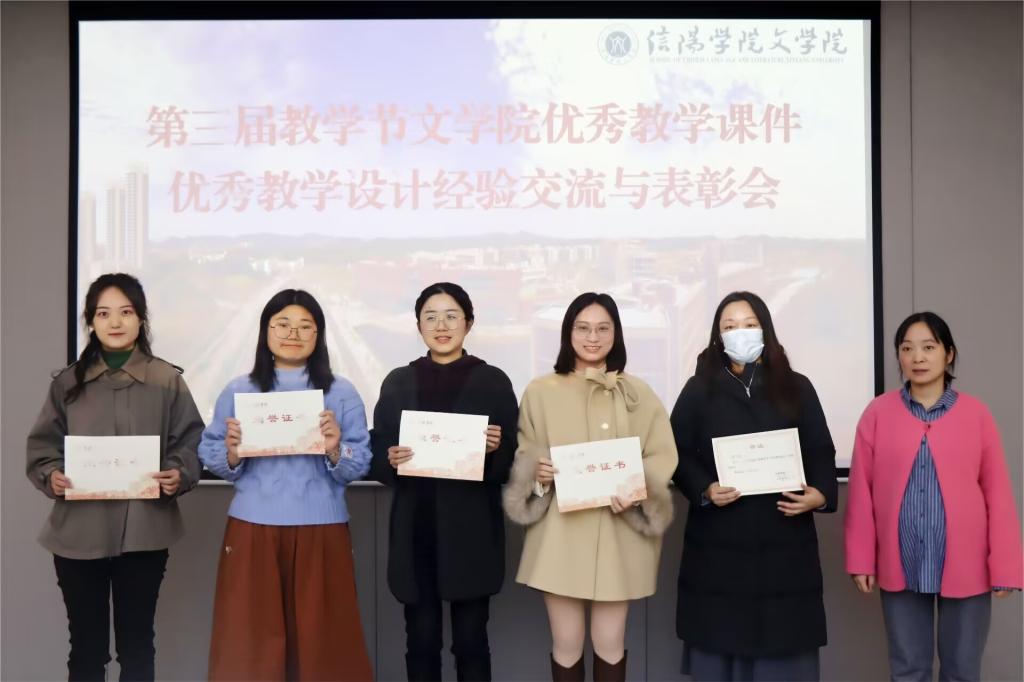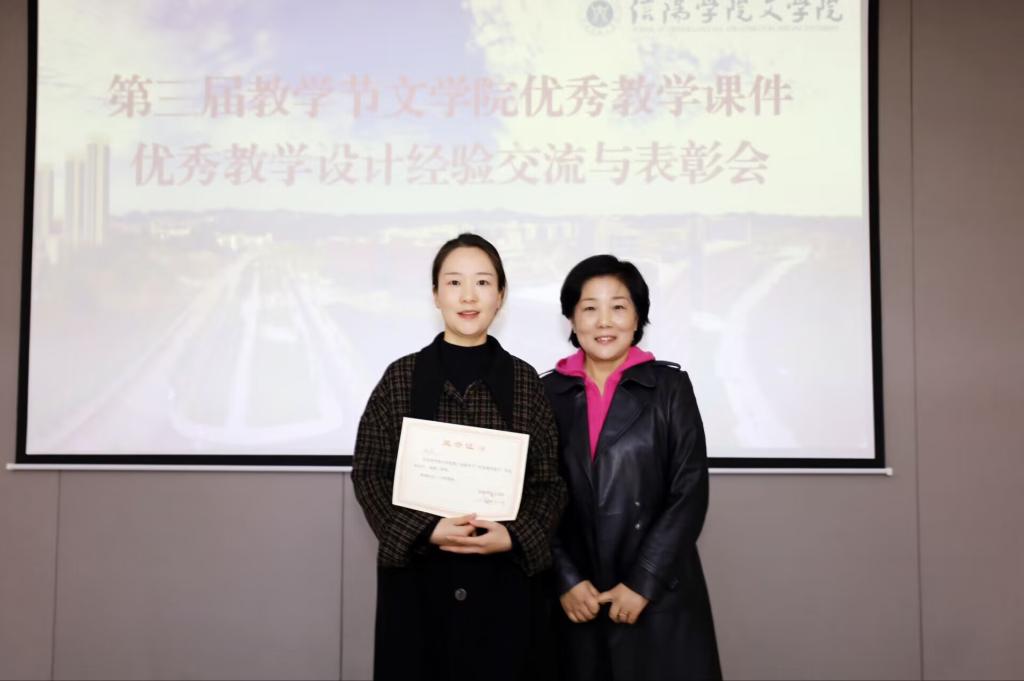 教学副院长黄亚妮宣读优秀课件优秀教学设计教师获奖名单,接着进入颁奖环节,由行政秘书陈俊与教学秘书陈浩为获得三等奖教师颁奖,由教学副院长为黄亚妮获得二等奖教师颁奖,由院长张凌江为获得一等奖教师颁奖。