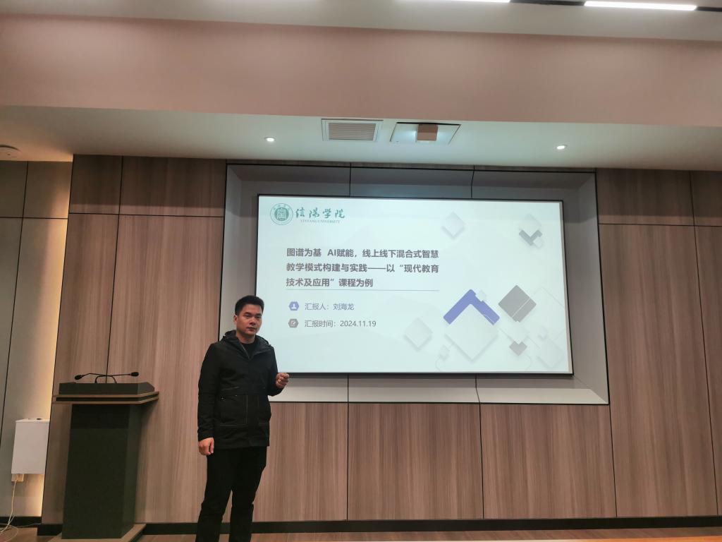 教育学教研室主任刘海龙老师担任了本次报告会的主讲教师。此次教学改革项目成果报告的题目是《图谱为基AI赋能,线上线下混合式智慧教学模式构建与实践——以“现代教育技术及应用”课程为例》。刘海龙老师从教改背景、教改设计与实施、思考和未来规划三个层面详细介绍了教改项目的进展情况和成果。其中重点讲述了其教改成果,“九位一体”混合式课程教学改革体系的构建,分两个阶段进行具体的实施。第一个阶段基于“BOPPPS+翻转课堂”的线上线下混合式教学;第二阶段知识图谱助力,AIGC赋能。