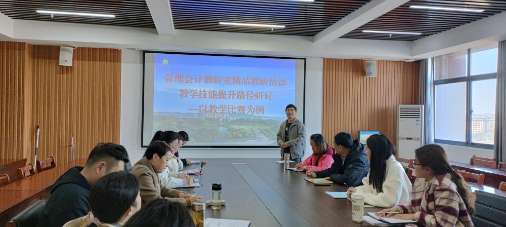 在教育改革不断深化的背景下,教师教学技能的提升成为提高教育质量的关键要素。为加快师资队伍建设,提高教师教学水平,商学院管理会计教研室于11月21日在综合楼715会议室开展以“教学技能提升路径研讨——以教学比赛为例”为主题的精品教研活动。活动由教研室主任黄振兴主持,商学院副院长吴新静、学校督导褚文凤、会计学专业学术带头人胡椰青及管理会计教研室全体教师参与了此次活动。