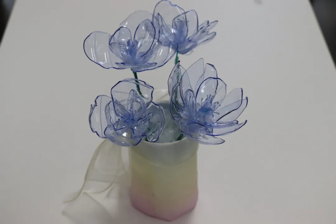 董明明、牛阳阳同学的团队作品“水桶风铃”,将废筷子、纸盒以及废弃绳子进行打造,赋予了它们全新的“使命”。“水桶风铃”制作精美,充分展现出两人成员极强的动手能力与协作精神,传递出他们对环保与创新的深刻理解。其余更有以快递盒为原料的“兔子存钱罐”“一路生花”“多功能日历”,以废口罩为原料的“灯笼”,以玻璃为原材料的“蝶影翩翩”,以废塑料瓶为原料的“永生花”等精美作品。