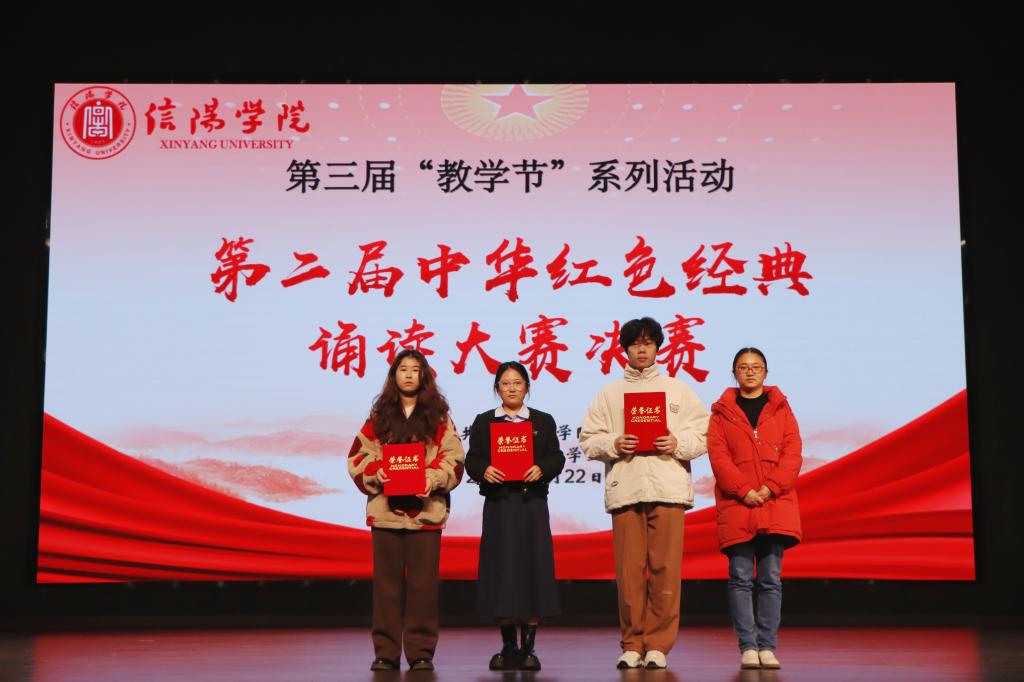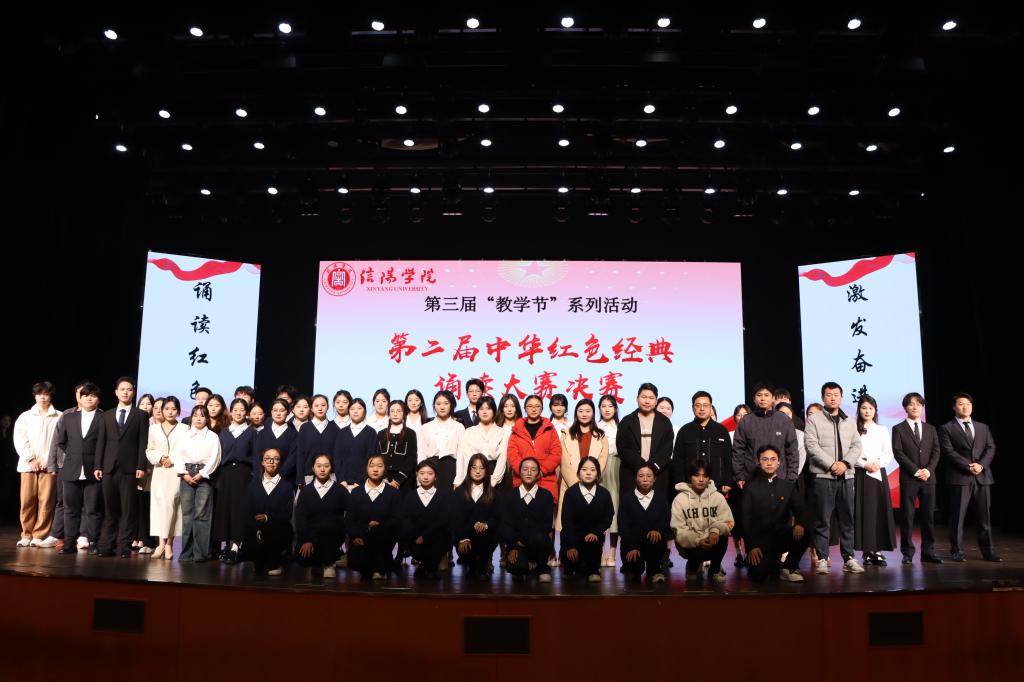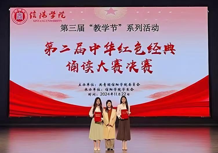 为深入学习宣传贯彻习近平新时代中国特色社会主义思想、习近平文化思想以及党的二十大、二十届三中全会精神,加强爱国主义教育,厚植爱国主义情怀,以诵读经典为载体,传递大学生对祖国的深情告白,11月22日,信阳学院第二届中华红色经典诵读大赛在音乐厅圆满落幕。本次大赛由校团委主办、学生会承办,主题为“诵读红色经典·激发奋进力量”。各学院团总支书记担任了本次比赛的评委,王施恩、谢龙龙主持了本次比赛。