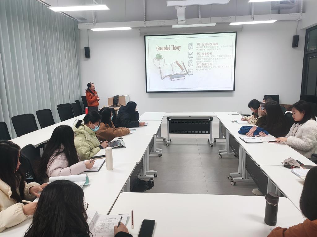 梁法丽老师从研究理论概述、研究路径的过程和步骤、研究创新和展望几个方面,结合自身教学和项目申报案例,展示了扎根理论这一特殊的质性研究方法。讲解了在扎根理论的实际应用中,需要确定访谈对象、数据采集、三级编码、模型构建以及理论饱和度检验等。青年教师纷纷表示这场学术盛宴让自己受益匪浅,明白了扎根理论注重从原始资料中产生结论和理论,从而对社会规则、规范和意义形成解释性理解,常常适用于明显具备“过程性”和“互动性”特征的某些社会现象。