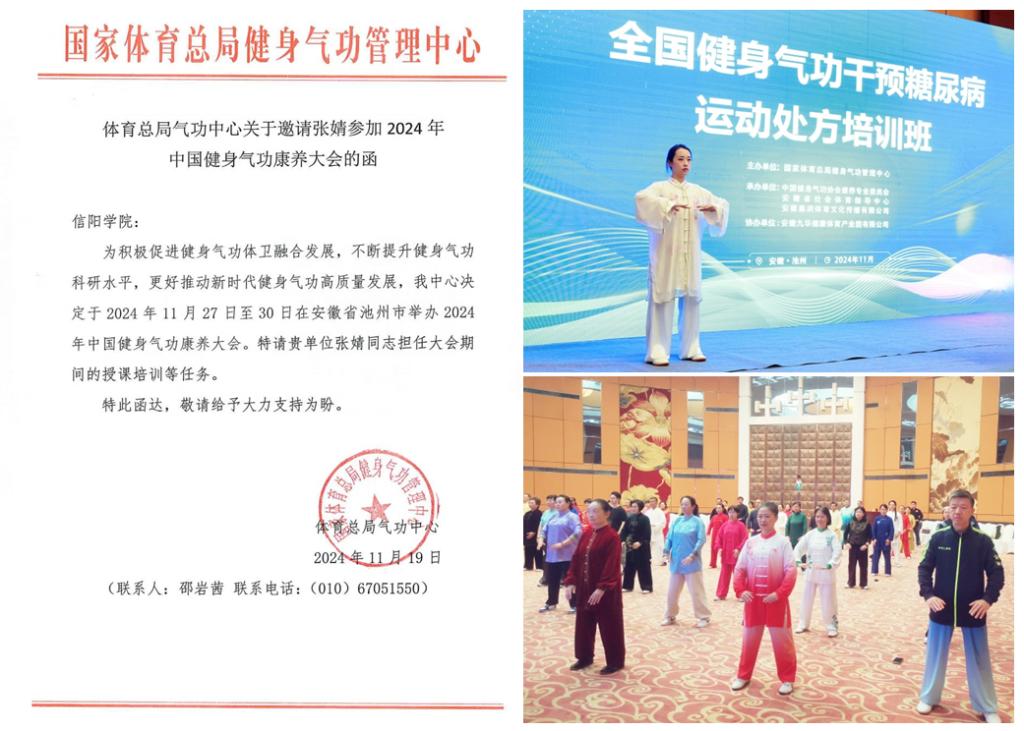 11月25日—30日,由国家体育总局健身气功管理中心、中国健身气功协会、安徽省体育局及安徽省池州市人民政府共同主办的首届中国健身气功康养大会在安徽省池州市举行。我校公共体育教学部张婧老师负责讲授“健身气功干预糖尿病运动处方”技能培训。