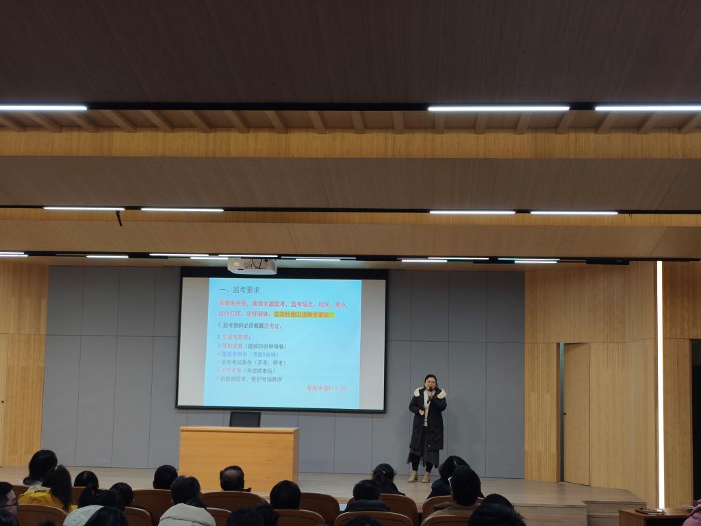 首先,教学秘书赵丹对期末考试监考要求、试卷评阅规范、试卷分析报告撰写要求、成绩管理、补考与缓考和各类教学档案归档要求做了详细的说明和讲解,并对监考老师进行了培训。在监考方面,监考教师需佩戴监考证,并提前领取试卷。主监考负责试卷领取、发布考试指令及试卷送交,而副监考则负责考场布置、学生入场、证件查验及违纪考生处理等。试卷评阅方面,要求使用红色笔进行批改,遵循“缺波错横,署改全名”的原则,每份试卷需手签全名,不允许盖章或签姓,以确保评卷的严肃性和准确性。赵丹强调,未按要求评定学生成绩、监考人员迟到、阅卷评分不认真等行为会根据教学事故的分类及处罚标准给予相应的处罚,提醒各位老师对自己和学院负责,做好期末的收尾工作。