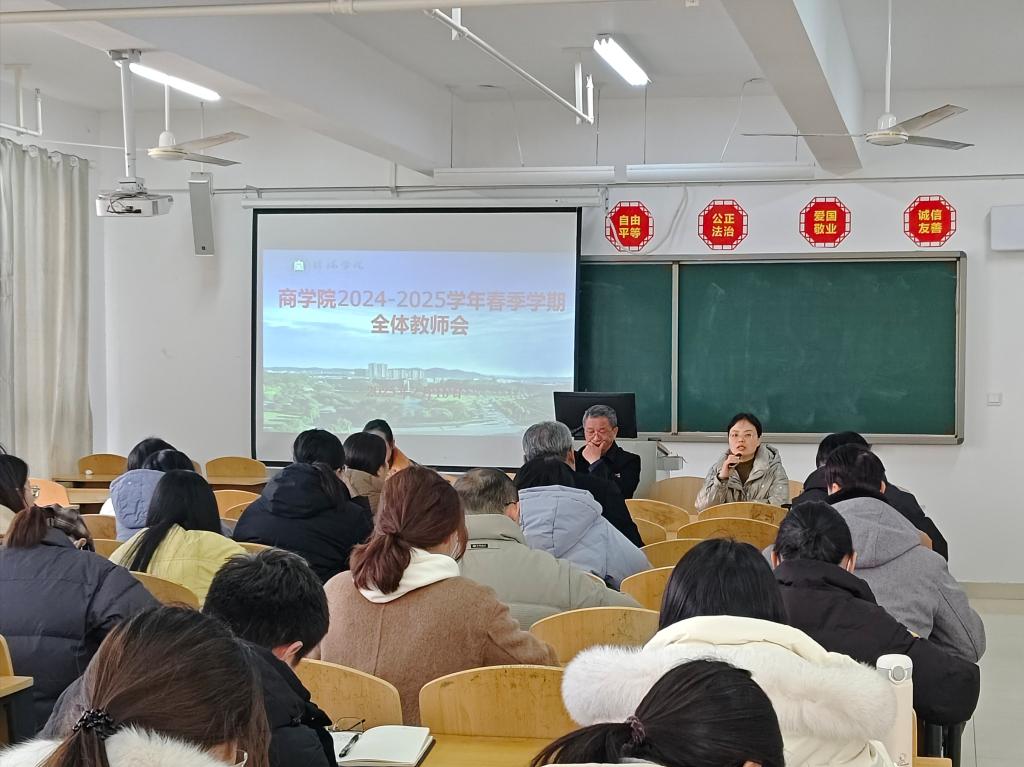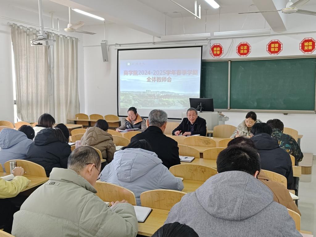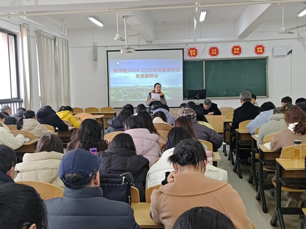 2月16日下午,商学院在综合楼608教室召开春季学期全体教师会,安排部署新学期各项工作。商学院党总支书记胡秀云、副院长李毓、吴新静、教学秘书盛大俊、学工干事花端阳、行政干事王爱霞及全体教师参加了此次会议。会议由胡秀云主持。